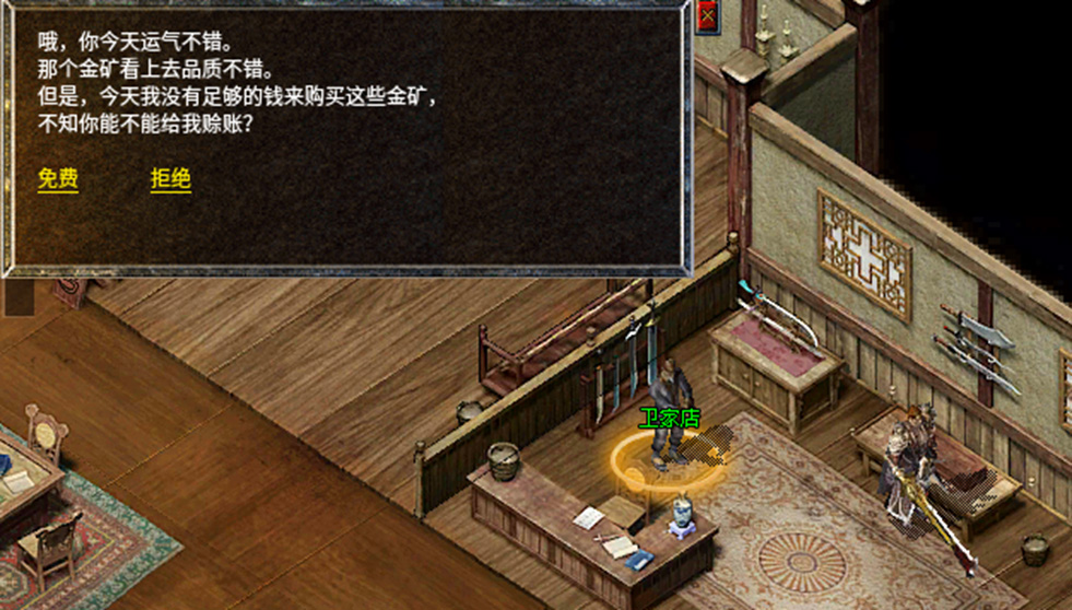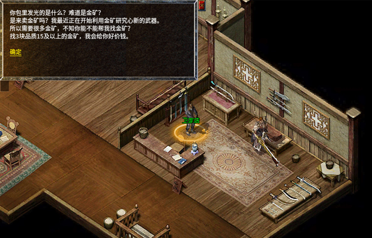 1、前往比奇省武器店铺卫家店进行对话,需要携带3块品质15及以上的金矿。