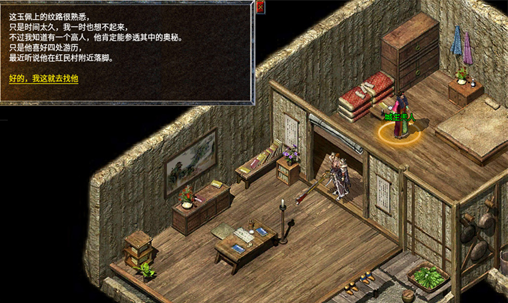 4、带着玉佩前往土城找到城主夫人,继续对话!需要寻找5块干肉给城主夫人。