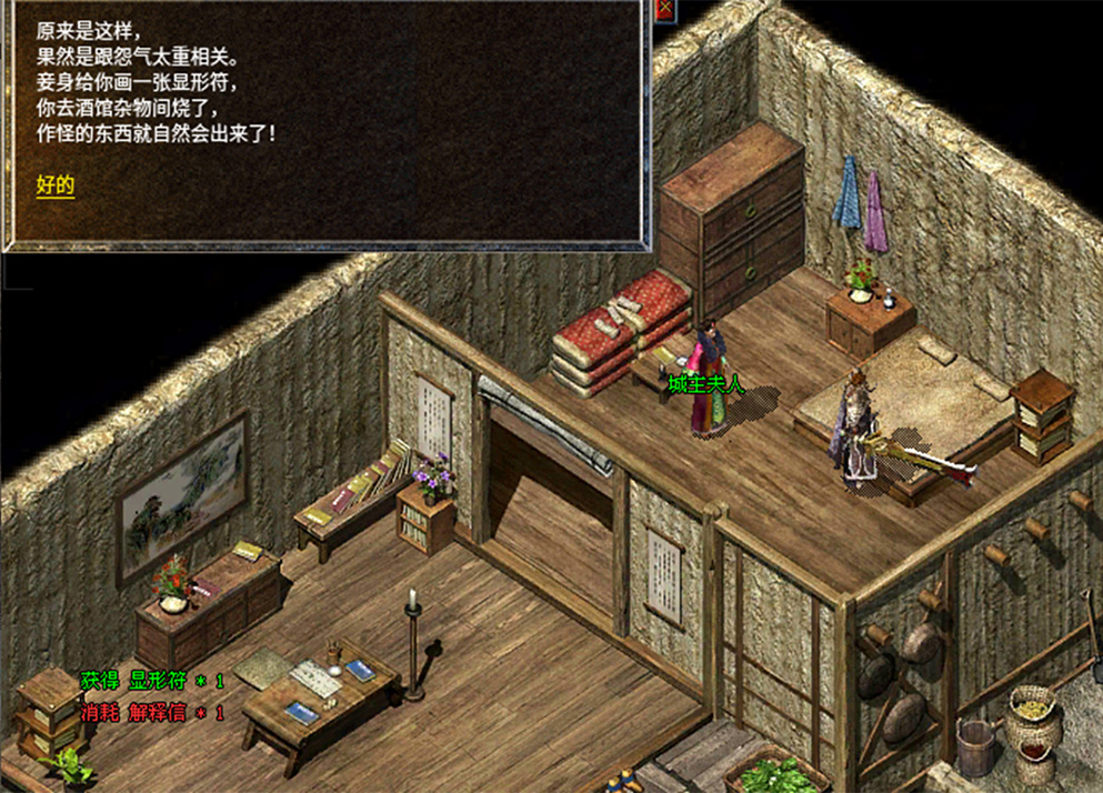 7、拿到感谢信找到城主夫人兑换显形符,需要前往卧龙酒馆的杂物间使用显形符。