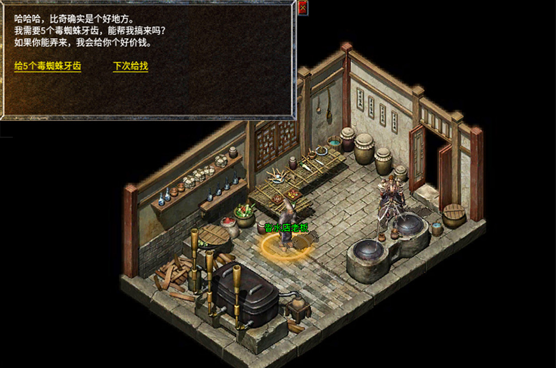 2、和沓水店老板对话,给对方5个毒蜘蛛牙齿,继续任务。