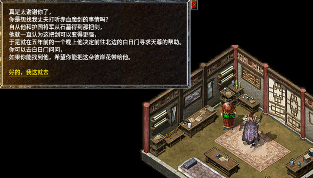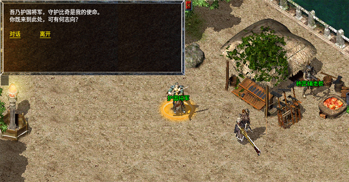 2、携带赤血魔剑前往比奇城找NPC护国将军完成对话。