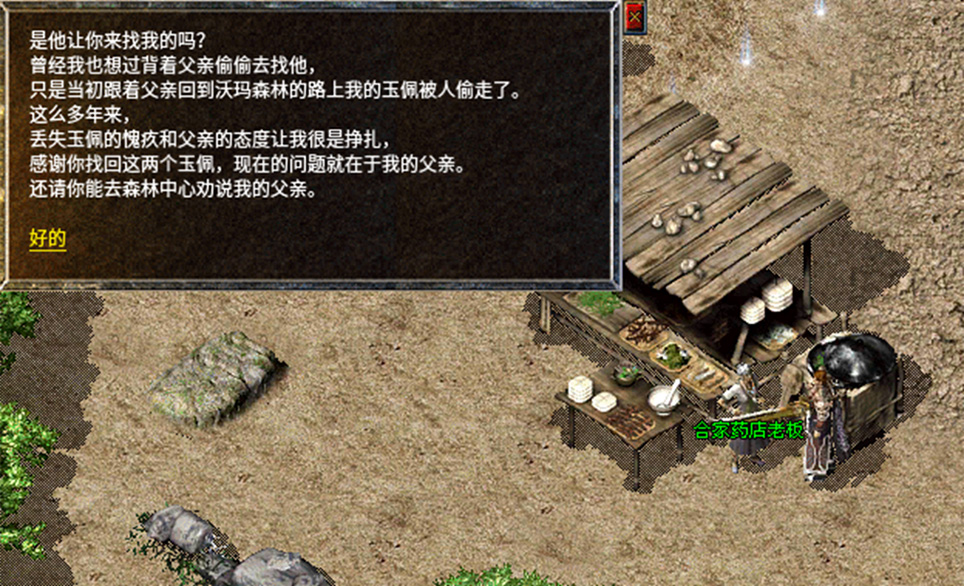 6、前往沃玛森林,将两块玉佩拿给药店老板查看。