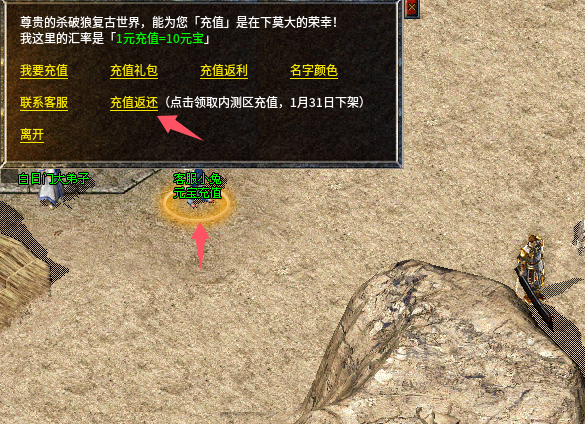 ②1月24日18点整,我们将记录所有充值角色此时所在的账号以及对应的充值金额;公测1区开放后,玩家仅需登入相同账号即可在比奇城或者盟重省的NPC客服小兔处领取。